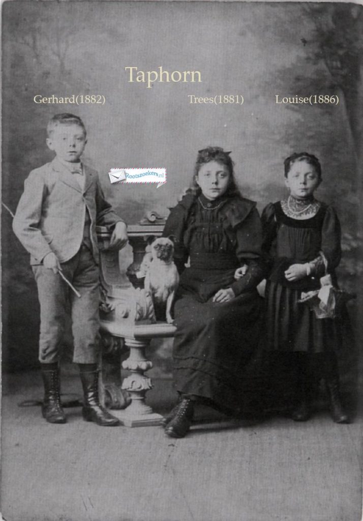 August Johann Bernard Taphorn huwde in 1879 te Franeker met Anna Maria Carolina Tombrock. August was koopman en had een manufacturenwinkel aan de Anjelierenstraat hoek 1 ste Anjelierdwarsstraat nr 24-26. Amsterdamsche Manufacturenhandel. Wat later Magazijn” de Zon” werd. Het zat het gezin niet mee ze kregen 9 kinderen waarvan er 6 doodgeboren e/o jong overleden zijn. Na het overlijden van zijn vrouw deed hij de zaak over aan zijn zoon en vertrok hij weer naar zijn geboorte plaats Essen i Oldenburg.