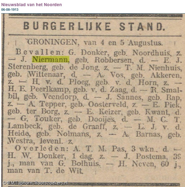 1913.familiebericht.Geboorte. Ebelina Bouwina Afiena Niermann