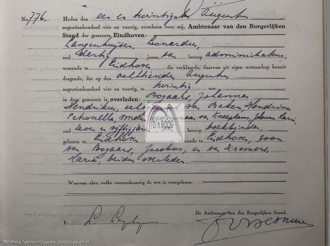 1942. overlijden Bogaars Theresia.A. gehuwd met C.F.Pluim. d.v. Bogaars Kremers.